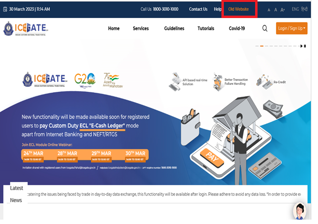 Click on the “Old Website” given on the homepage to proceed with icegate registration.