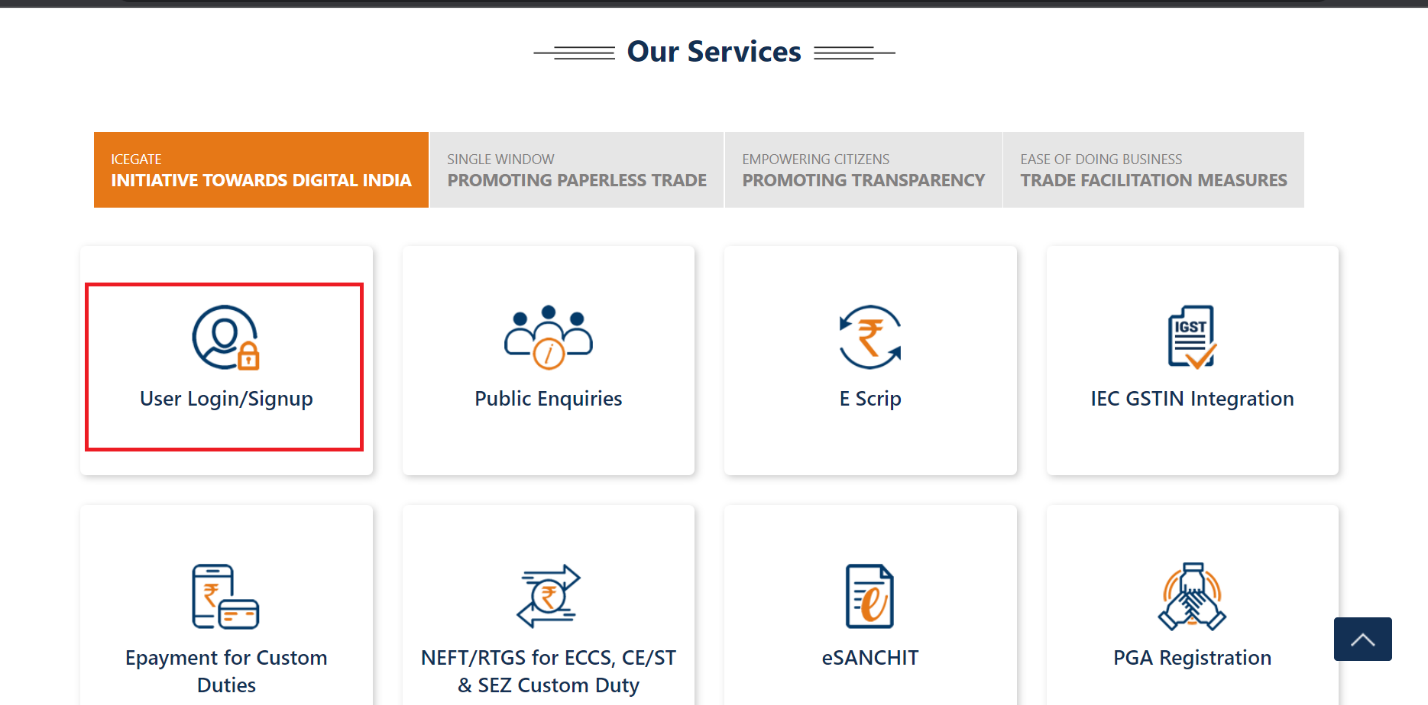 After clicking on the old website, Click on the “User login/Signup” option on the Homepage of ICEGATE.
