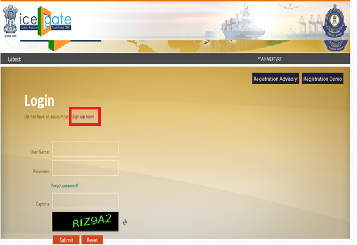 To register on ICEGATE the applicant will have to click on the option of “Sign up now”