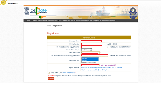 Once clicked on the “confirm” tab, the page will go to the next step to fill in all the details like name, mobile number, aadhar no & documents. Mobile number and email id should be the same as DGFT registration. For this step, DSC should be connected to upload the documents.