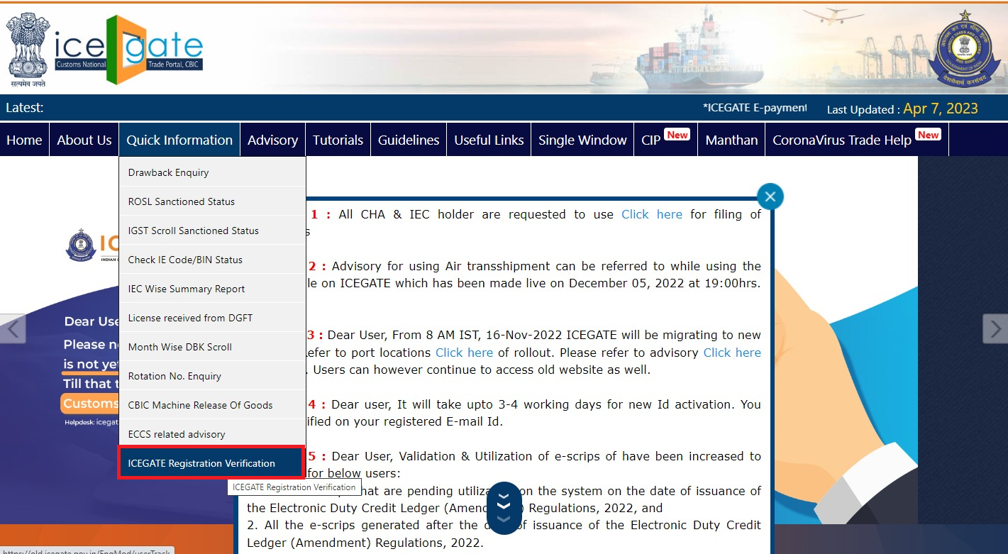Indian Customs Electronic Gateway (ICEGATE) is the name of the public portal operated by the Central Board of Indirect Taxes and Customs (CBIC). The customs office provides e-commerce services to importers, exporters, freight carriers, and other business partners via this website platform. This simplifies the customs agreement process and promotes EXIM business.