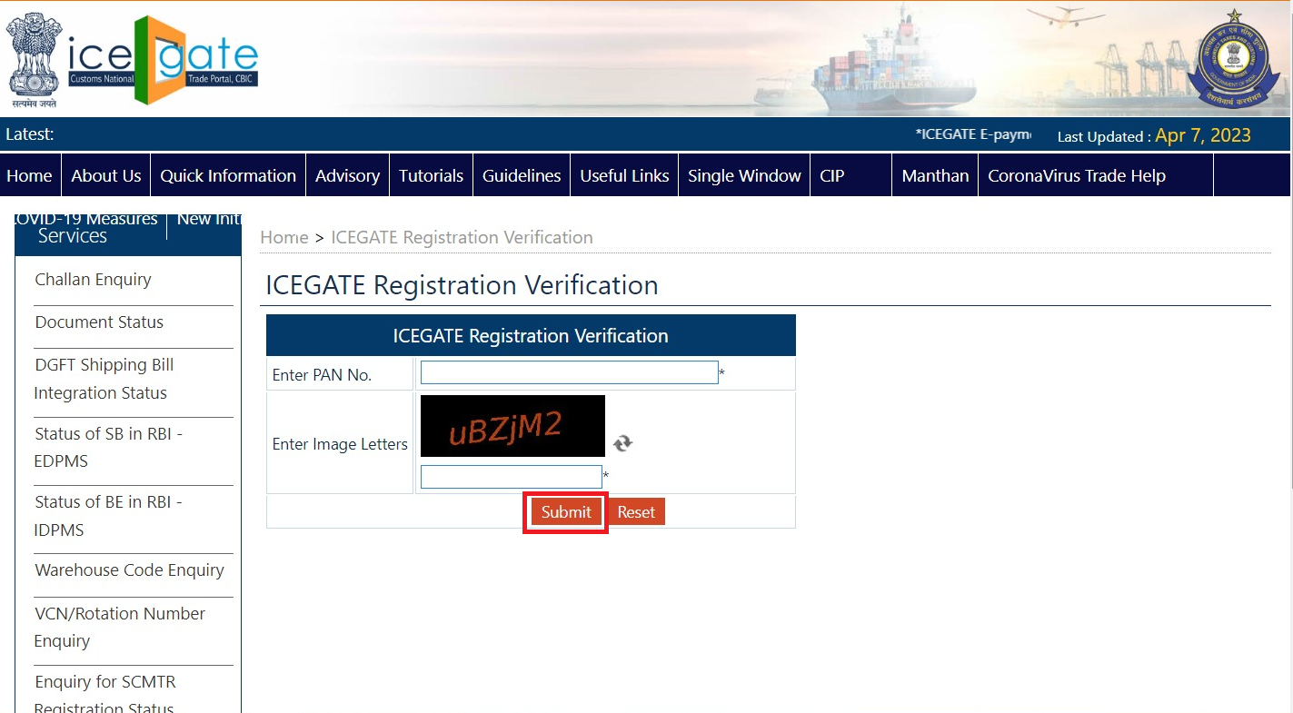 ii. Enter “PAN No. & Image Letters” and click on submit to check the status of your ICEGATE registration.
