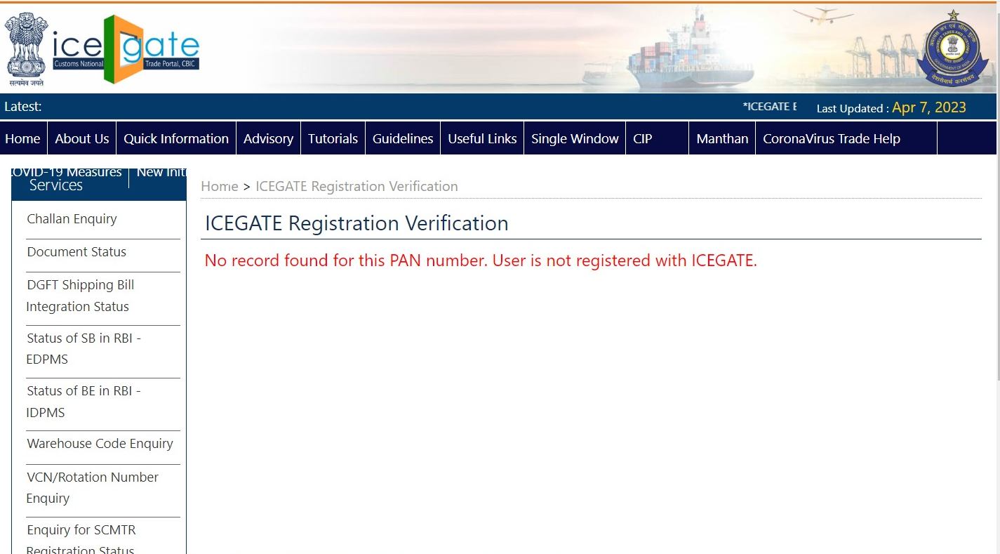 iv. It will show the below image if the ICEGATE ID is not active with the definition of “No record found for this PAN number. User is not registered with ICEGATE”.